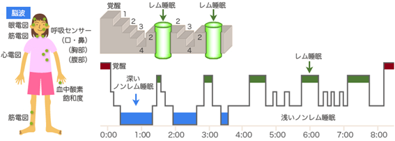 ヒトの睡眠はノンレム睡眠(non-REM sleep)とレム睡眠(REM sleep)という質的に異なるふたつの睡眠状態で構成されています。レム睡眠は、眠っているときに眼球が素早く動く(英語でRapid Eye Movement)ことから名づけられました。