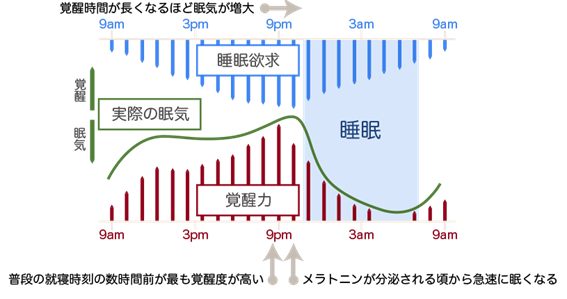 覚醒力は日中を通じて増大し、徐々に強まる睡眠欲求に打ち勝ってヒトを目覚めさせます。普段の就床時刻の数時間前に覚醒力は最も強くなり、その後、メラトニンが分泌される頃(就床時刻の1~2時間前)になると、覚醒力は急速に低下します。このため、私たちは夕食後に団欒するなどすっきり目覚めていても、就床時刻あたりで急に眠気を感じるようになります。もし覚醒力がなければ、徐々に強まる睡眠欲求のため、日中の後半は眠気との戦いで質の高い社会生活は営めなくなるでしょう。