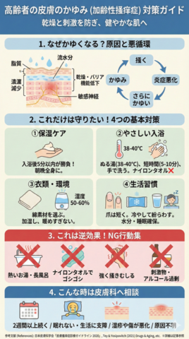高齢による皮膚のかゆみは誰にでも起こり得る悩みですが、適切な知識とケアで予防・改善することができます。毎日のちょっとした心がけの積み重ねが、乾燥知らずの健やかな肌を取り戻す鍵です。「かゆいのは年齢だから仕方ない…」と諦めずに、本記事で紹介した対策をぜひ実践してみてください。根気よくケアを続ければ、きっと「そういえば最近かゆみが楽になった」と感じられる日が来るはずです。つらいかゆみを抑えて、快適な毎日を送りましょう。